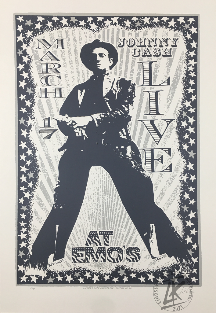 "I met Johnny the morning of the show at Emo's and asked if he would like a show poster to commemorate the event that night and he said he would love it if we could get something done that day. I was working out of my small garage that month, i.e. "Bad Press" and whipped a poster out that day with the assistance of Leeroy and others who were staying in my house for that SXSW. We had prints drying all over the house and garage. Paper and ink colors were all over the place cause I used what I had lying around the garage. We made about 50-75 posters and brought them up that night and gave most of them away to johnny, his band, friends & record people that were at the show." -LxKuhn