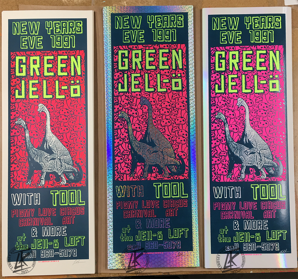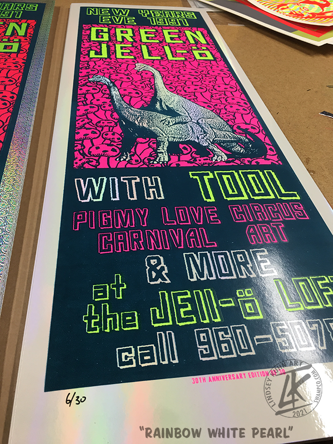 In the Spring of 1991 I started printing rock posters and art prints for some of the coolest lowbrow artists of that time in a small printshop in Austin, TX. The shop was run by L'imagerie Gallery, based in Southern California.  That year I started experimenting on printing my own art on paper and after a couple art prints ended up making my first rock poster for some friends in Hollywood. I really didn't know what I was doing but came up with a fun design to help promote the show. Most of the posters ended up in the streets of Hollywood or on walls of the people who had something to do with the show. Over the past 30 years that posters has been collected and bootlegged all over the world. If you have an original you are stoked, if not then here is your chance to get the 30th anniversary print.